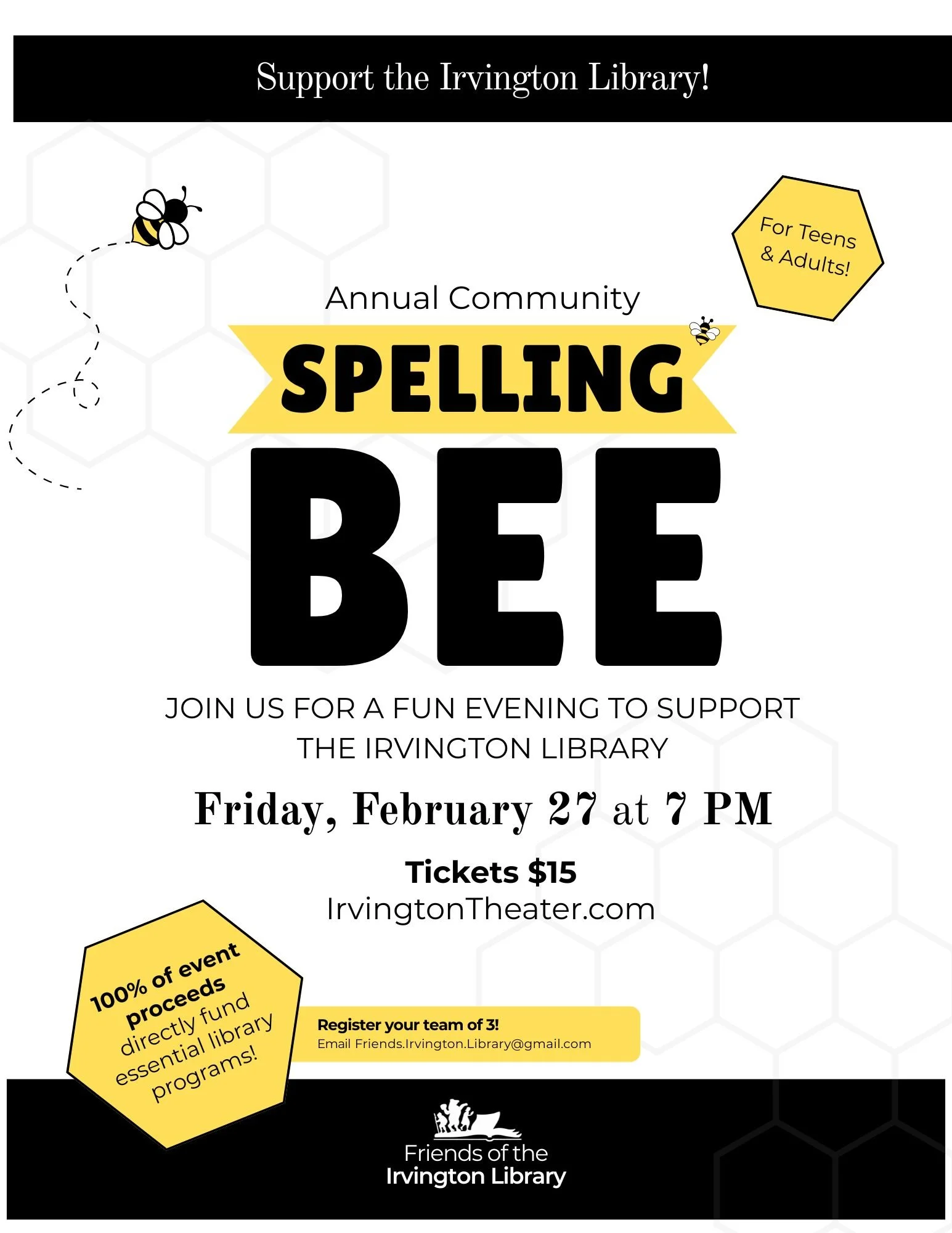 The Friends of the Irvington Library are thrilled to once again present one of our buzziest fundraisers of the year — the Irvington Community Spelling Bee!